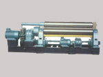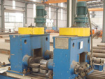 三輥對稱式,上輥在兩下輥中央對稱位置作垂直升降運動,通過絲桿絲母蝸桿傳動而獲得兩下輥作互轉運動,通過減速機的輸出齒輪與下輥齒輪嚙合,為卷制板材提供扭矩。