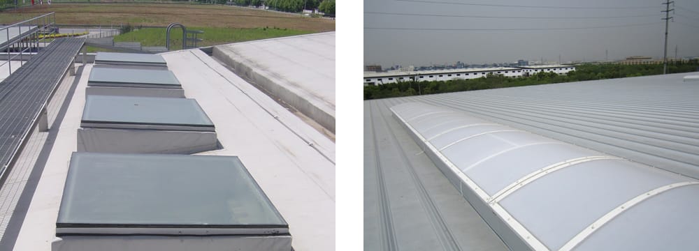 安裝在屋頂采光天窗,打破了廠房一貫平直的線條結構,通風采光天窗有規律性的設計以及其符合建筑整體風格的顏色,增加了建筑的美感,創造了新穎而獨特的平頂建筑。